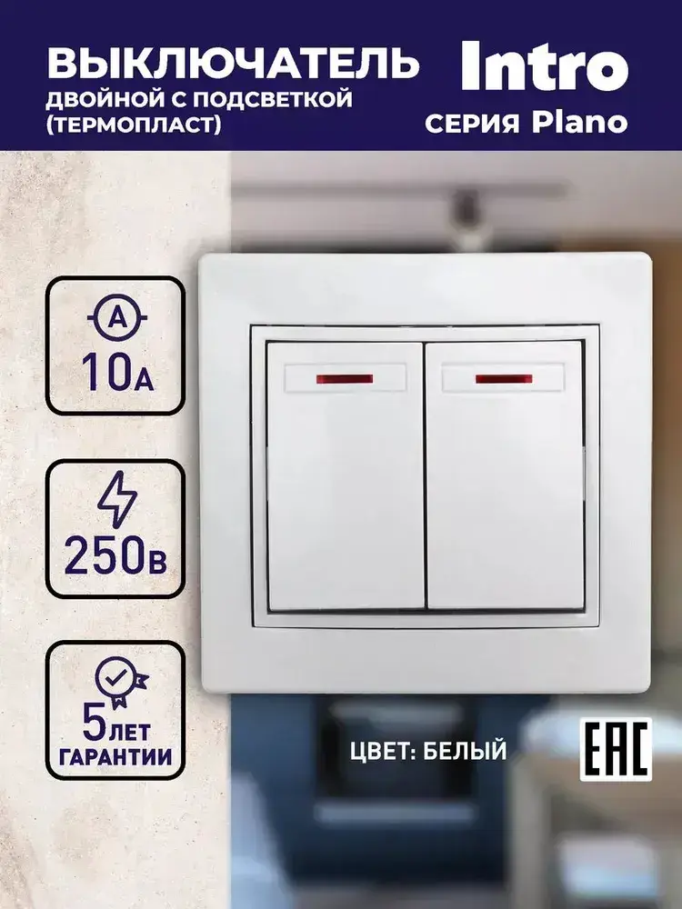 Выключатель Intro Plano 1-105-01 двухклавишный с подсветкой 10А-250В IP20 СУ Plano белый