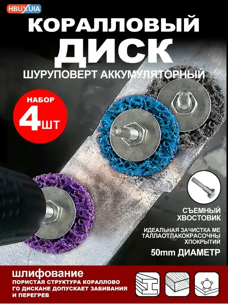 Зачистной диск по металлу (коралловый диск для удаления ржавчины) 50 мм для дрели и шуруповерта фиолетовый 4 шт.