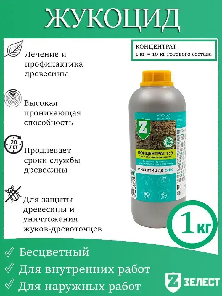 Зелест Жукоцид С-1К для защиты древесины и уничтожения жуков-древоточцев. Бесцветный, 1 кг