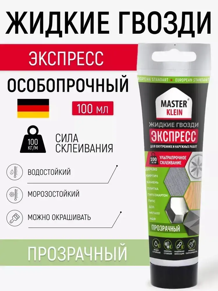 Жидкие гвозди экспресс "Master Klein", прозрачный клей для панелей и плитки, туба 100 мл
