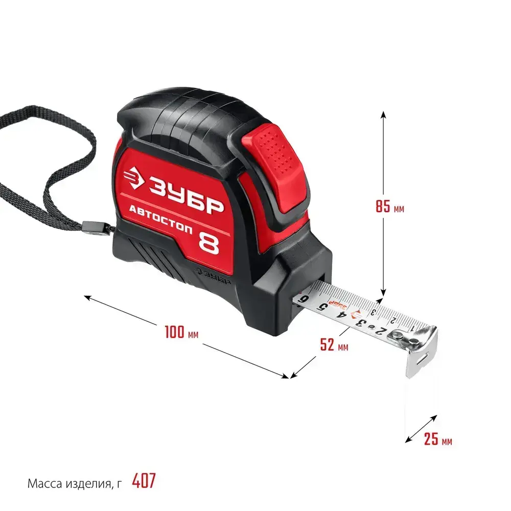 ЗУБР. Строительная рулетка 8 м х 25 мм. с автостопом и ударостойким обрезиненным корпусом.